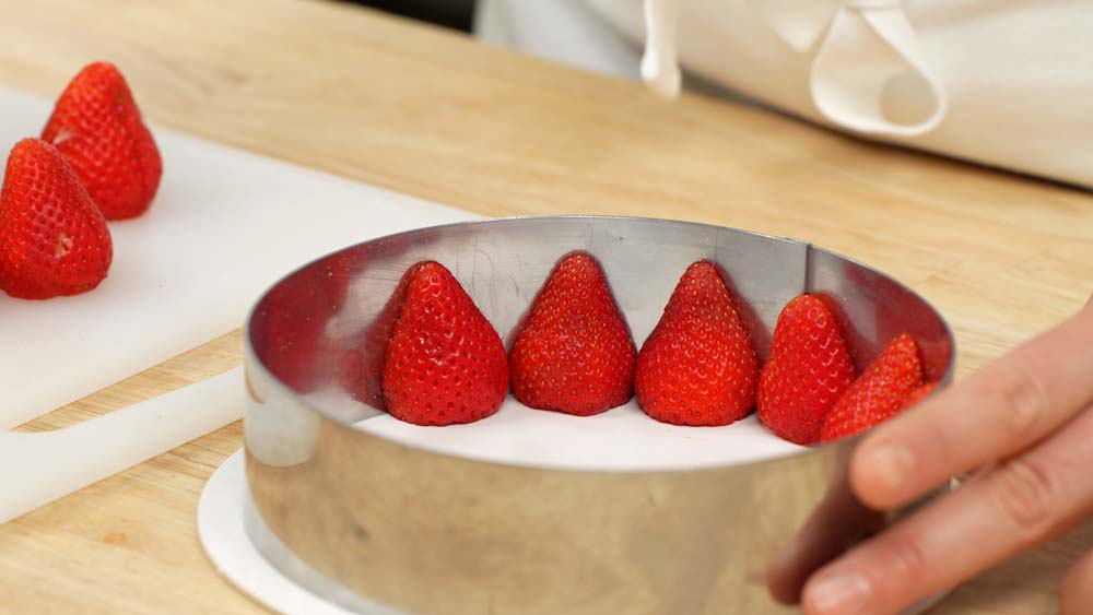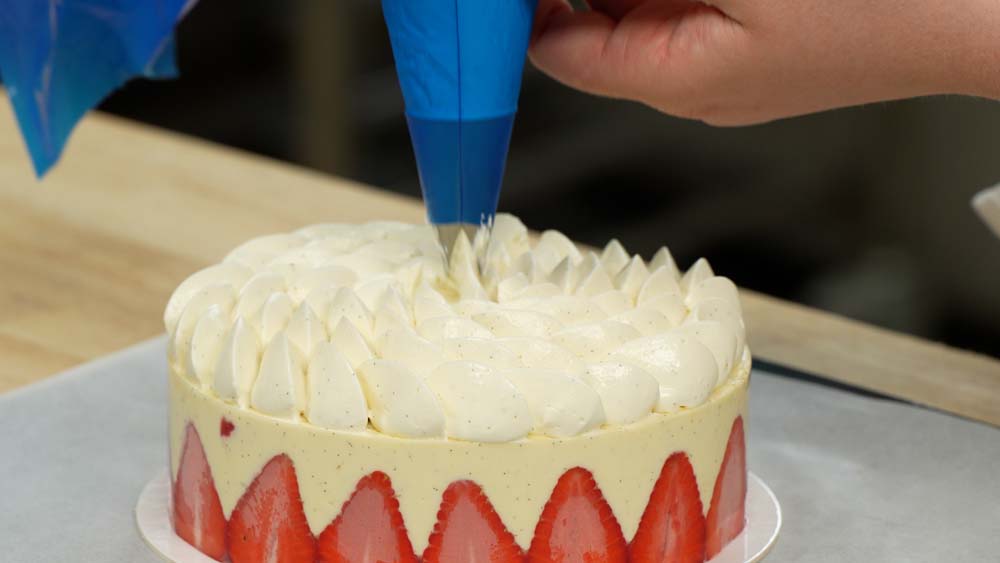 A fresh and vibrant French classic composed of soft génoise, mousseline cream, and whole strawberries, finished with marzipan or glaze.